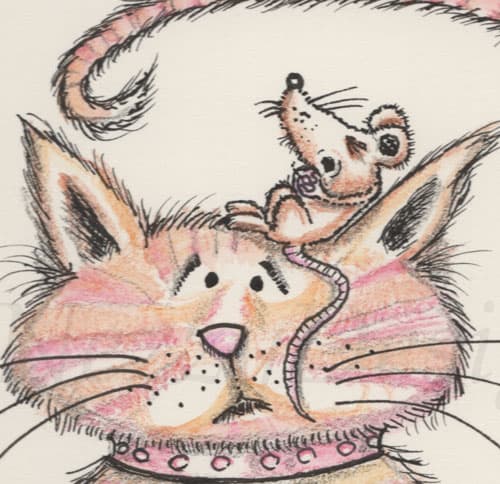Original Artwork – cat and sleeping mouse cartoon design by Nezzy in pen, ink, and watercolour. Created on 300g.s.m. watercolour paper mounted in a high-quality cream mount. The mount has an aperture of approx 6.75” x 4.75” and is ready to fit straight into a standard 9” x 7” frame.