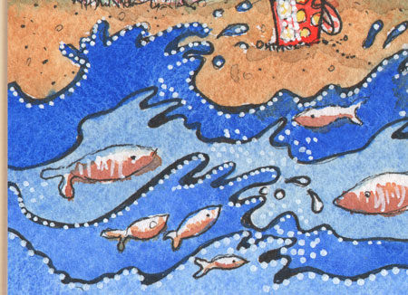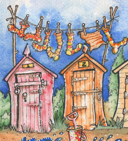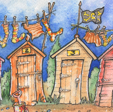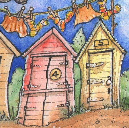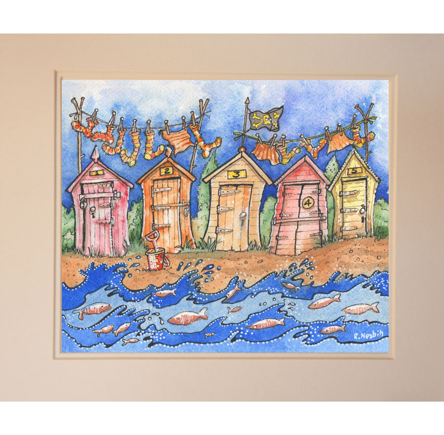 Five Beach Huts – Original Pen, Ink & Watercolour by Rob Nesbitt