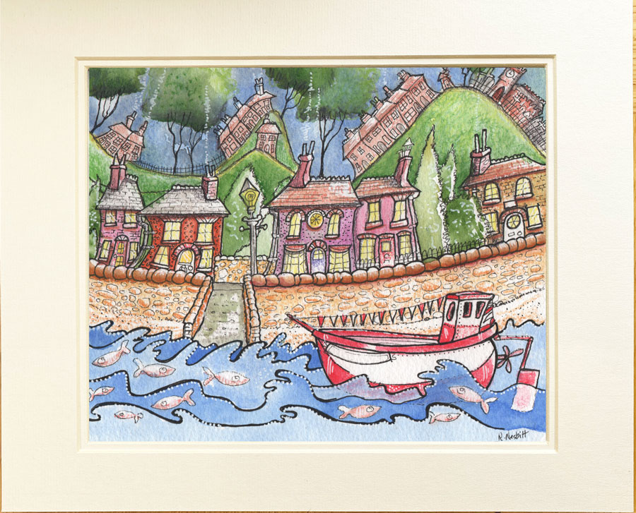 Totally original ‘Harbour Village’ by Rob Nesbitt in pen, ink, and watercolour. Created on 300g.s.m. watercolour paper mounted in a high-quality cream mount. The mount has an aperture of approx 8.5” x 7” and is ready to fit straight into a standard 12” x 10” frame. Provenance (for authenticity) is provided with the artwork.