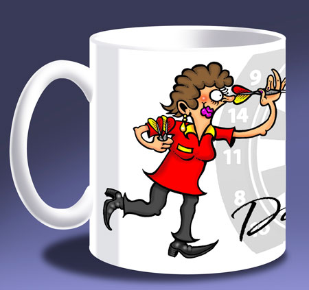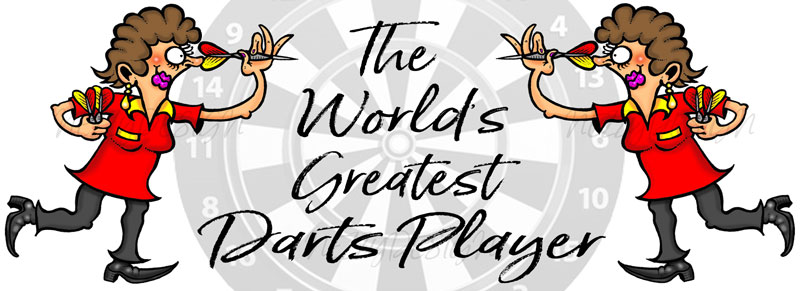 Ideal gift or presentation for a female darts player!. The cartoon character is in a dart style shirt, throwing darts with the caption ‘The World’s greatest Darts Player’