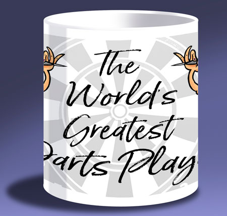 Premium quality 10ozs European white ceramic mug with an original design and caption ‘The World’s Greatest Darts Player’ by cartoonist Nezzy. High gloss finish sublimation printed design. Dishwasher safe – though we strongly recommend that you hand wash only as harsh dishwasher cycles will fade the design over time
