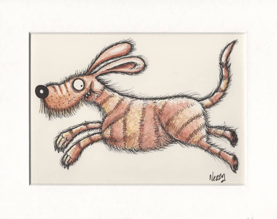 Original Artwork – wild dog at full pelt cartoon design by Nezzy in pen, ink, and watercolour. Created on 300g.s.m. watercolour paper mounted in a high-quality cream mount. The mount has an aperture of approx 6.75” x 4.75” and is ready to fit straight into a standard 9” x 7” frame.
