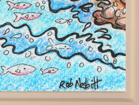 Totally original ‘Wonky Harbour’ by Rob Nesbitt in pen, ink, and watercolour. Created on 300g.s.m. watercolour paper mounted in a high-quality cream mount. The mount has an aperture of approx 8.5” x 7” and is ready to fit straight into a standard 12” x 10” frame. Provenance (for authenticity) is provided with the artwork.